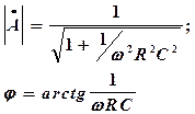 ФВЧ- это схема, которая передает без изменений сигналы высоких частот, а на низких частотах обеспечивает затухание сигналов и опережение их по фазе относительно входных сигналов. Амплитудно- частотные и фазово- частотные характеристики опять получим из отношения: