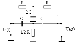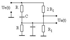 Двойной Т- образный фильтр обладает частотной характеристикой, идентичной частотной характеристике фильтра Вина- Робинсона. Он тоже пригоден для подавления сигналов в определенной частотной области. В отличие от моста Вина- Робинсона выходное напряжение снимается относительно общей точки. Для высоких и для низких частот Ua=Ue. Модуль и фазовый сдвиг равны:
