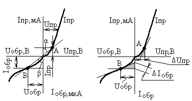 Статические прямое и обратное сопротивления являются сопротивлениями диода по постоянному току для заданных точек вольт- амперной характеристики (рис. а). Определение статического (а) и динамического (б) сопротивления
