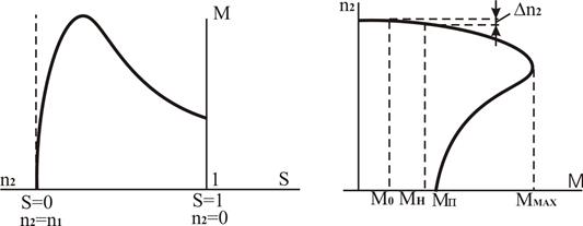Поясним некоторые рабочие характеристики. Частота вращения n 2 при изменении нагрузки 0 < Р 2 < Р 2н уменьшается незначительно, так как механическая характеристика у ТАД жесткая и скольжение при номинальной нагрузке невелико (s н = 4…8 %) [3]. Момент вращения, как видно из рисунка (7.8), связан с полезной мощностью простым соотношением по линейному закону. Поэтому зависимость М вр = f (P 2) носит почти линейный характер. Однако при Р 2 = 0, момент вращения не равен нулю, т.к. в двигателе существуют потери энергии и М вр = М пот (момент потерь). Потребляемый из сети ток I 1 на холостом ходу создает ВМП и имеет малую активную и большую реактивную составляющие. С ростом нагрузки активный ток увеличивается и становится больше реактивного. Активная потребляемая мощность Р 1 на холостом ходу мала и расходуется на покрытие потерь механических и в магнитопроводе. С увеличением нагрузки растут потребляемый активный ток и активная потребляемая мощность. Коэффициент мощности двигателя определяется по известной формуле: cosj1 = где S 1, P 1, Q 1 — полная, активная и реактивная мощности двигателя. Скольжение s с ростом нагрузки увеличивается, так как уменьшается скорость вращения двигателя. Коэффициент полезного действия (КПД) определяется, как обычно, отношением полезной мощности (механическая мощность на валу двигателя) Р 2 к затраченной, т.е. потребляемой из сети Р 1: h = где U 1, I 1 — линейные напряжение и ток; j1 — угол сдвига фаз между линейным напряжением и током. Механической характеристикой (МХ) двигателя является зависимость частоты вращения от момента нагрузки на валу при постоянных значениях напряжения U 1 и частоты питающей сети f, т.е. n 2 = f (M). МХ, по существу, является обратной зависимостью по отношению к зависимости момента вращения от скольжения, показанной на рисунке 8.10. Действительно, при s = 0 получим n 2 = n 1, а при s = 1, n 2 = 0. Поэтому, если перенести ось ординат в точку s = 1, получим n 2 = 0, повернув оси координат на 90° по часовой стрелке, получим механическую характеристику n 2 = f(M), приведенную на рисунке 7.8, б.