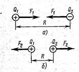 Рис.2 Рис.3 Силы заимодействия полей двух зарядов направлены так, что разноименные заряды (положительный и отрицательный) притягиваются, а одноименные заряды (положительные или отрицательные) отталкиваются (рис.2а,б). Закон Кулона справедлив для точечных зарядов.