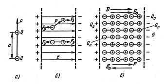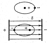 По сравнению с проводниками количество свободных заряженных частиц в диэлектрике очень мало. Диэлектрик, внесенный в электрическое поле, так же как и проводник, электризуется. Однако между электризацией проводника и диэлектрика имеется существенная разница. Если в проводнике под влиянием сил электрического поля свободные электроны передвигаются по всему объему проводника, то в диэлектрике свободного перемещения электрических зарядов произойти не может. Но в пределах одной молекулы диэлектрика возникает смещение положительного заряда вдоль направления электрического поля и отрицательного заряда в обратном направлении. В результате этого смещения зарядов на поверхности диэлектрика возникают электрические заряды. Это явление называется поляризацией диэлектрика. Различают диэлектрики с полярными (вода, аммиак, эфир, ацетон и т.д.) и неполярными молекулами. Полярные молекулы можно рассматривать как электрический диполь (рис.24 а).