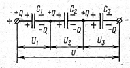 т.е. величина, обратная полной емкости батареи последовательно соединенных конденсаторов, равна сумме обратных емкостей каждого конденсатора. Анализ последней формулы позволяет сделать вывод о том, что полная емкость последовательно включенных конденсаторов меньше наименьшей из емкостей конденсаторов. Если емкости последовательно соединенных конденсаторов одинаковы, т.е. С1 =С2 =С3, то емкость батареи равна С =С1/3. Т.к