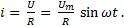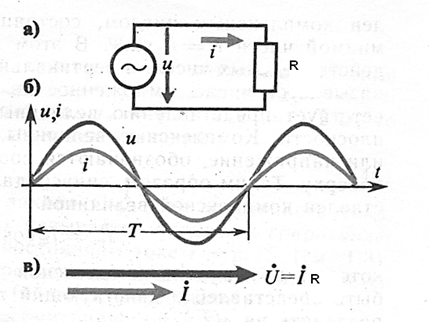 Рис. 67 Однофазная электрическая цепь с активным сопротивлением: а – схема, б, в - временная и векторная диаграммы. Ток в цепи. Согласно закона Ома, в цепи протекает переменный ток, мгновенное значение которого определяется выражением: