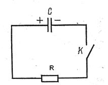 где Выражение показывает, что ток в цепи изменяется также по убывающей экспоненте, имея максимум в момент включения цепи, т.к. при Разрядка конденсатора. На рис. 131 показана схема при разрядке конденсатора на резистивный элемент.