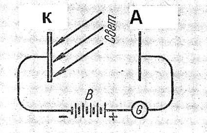 Главными направлениями работ в области преобразования солнечной энергии в настоящее время являются: 1. - прямой тепловой нагрев (получение тепловой энергии) и термодинамическое преобразование (получение электрической энергии с промежуточным преобразованием солнечной энергии в тепловую); 2. - фотоэлектрическое (прямое) преобразование солнечной энергии в электрическую. Тепловой нагрев является наиболее простым методом преобразования и широко используется в южных районах России в установках солнечного отопления, снабжения горячей водой, охлаждения зданий, опреснения воды и т.д. Концентрация солнечной энергии осуществляется на гелиоприемнике с помощью плоских, сферических или параболлоидных зеркал. Вода или другая жидкость, находясь в контакте с поглотителем солнечной радиации, нагревается и при помощи насоса или естественной циркуляции отводится от него. Затем нагретая жидкость поступает в хранилище, откуда ее потребляют по мере необходимости. Подобное устройство напоминает системы горячего водоснабжения. В солнечных элементах используется явление фотоэффекта, т.е. вырывание электронов из того или иного материала под действием света. Различают внешний и внутренний фотоэффект. При внешнем фотоэффекте (рис.160), свет проникает в вакуумированный сосуд и освещает катод К, изготовленный из металла. Фотоны света выбивают из металла «связанные» электроны. В пространстве К-А появляются носители электрического заряда. Под действием электрического поля эти электроны перемещаются и попадают на анод. В результате электрического замыкания промежутка К-А во внешней цепи появляется электрический ток (фототок), который фиксируется гальванометром G или микроамперметром.
