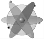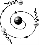 Рис.171 Модель атома Резерфорда Рис. 172 Траектория, по которой двигался бы электрон по законам классической физики искривлена, а из теории Максвелла следует, что такой заряд при движении должен испускать электромагнитные волны, теряя при этом часть своей энергии (рис. 172). Таким образом, из законов классической физики неизбежно следовал вывод, что, двигаясь ускоренно по определенным орбитам, электрон, излучающий энергию в виде электромагнитных волн, со временем должен терять скорость и, в конце концов, упасть на ядро (что положило бы конец существованию атома). Согласно теоретическим расчетам, атомы бы прекратили свое существование примерно за наносекунду, что, конечно же, противоречит долговременной стабильности атома в действительности. Кроме того, совокупность таких атомов должна была бы давать сплошной спектр излучения (Видимая часть спектра от красного до фиолетового и невидимая часть спектра, включающая инфракрасное и ультрафиолетовое излучение), а не линейчатый, наблюдаемый на опыте.