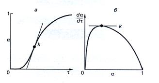 Рис. 198 Кинетические кривые: степень фазового превращения как функция времени (а) и скорость твердофазного превращения как функция степени превращения (б) Из рис.198а следует, что на начальной стадии реакции ее скорость мала (индукционный период), затем резко возрастает (время роста скорости реакции), проходит через максимум k и далее снижается до нуля. Соответствующая зависимость σ=f(τ) изображается S- образной кривой. Скорость реакции, достигнув максимума, начинает снижаться, когда растущие зародыши продукта начинают сливаться, образуя сплошной слой (рис.198б) Использование дисперсных сред показало, что наноматериалы обладают чрезвычайно высокой хим. активностью, которая проявляется в изменении температуры, скорости, теплового эффекта взаимодействия, степени превращения при конкретных условиях реакции, повышенной пирофорности, особых каталитических свойствах. Наночастицы способны эффективно взаимодействовать со многими инертными веществами, включая инертные газы и благородные металлы. Например, обнаружено, что при дроблении на поверхности нанопорошков происходит необратимая адсорбция инертных газов. В некотором смысле справедливо утверждение, что для наноматериалов не существует инертной среды. Этому способствует прежде всего сильно развитая поверхность и избыточная энергия поверхностных атомов. Размерные эффекты в хим. процесса. Размерный эффект в хим. процессах проявляется, прежде всего, в изменении закона реагирования. Скорость хим. реакции для большого количества гетерогенных хим. процессов с участием твердых фаз определяется диффузией в твердом теле. Однако это справедливо, когда радиус реагирующей частицы R существенно больше диффузионного пути (σ), определяемого выражением: