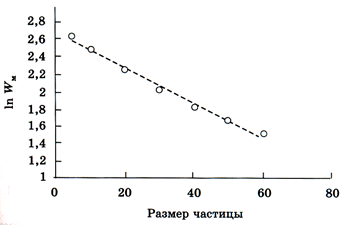 где D - коэффициент диффузии, t – время. Если σ ≥ D, толимитирующей стадией процесса становится собственно хим. реакция. Следовательно, для гетерогенных реакций существует граничный размер частиц, при котором происходит изменение кинетических закономерностей процесса. Как показывают расчеты, с уменьшением размера частицы скорость химической реакции экспоненциально возрастает. Данный результат иллюстрирует нижеследующий рисунок (рис. 199), где приведена зависимость максимума скорости реакции W от размера частицы при плотности зародышей карбида железа 0,23.