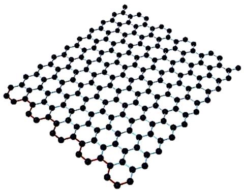 Рис.212 Модель графена. Хотя графит известен с незапамятных времен, изолированные графеновые плоскости научились получать и исследовать только в 2004 году. Профессор А. Гейм совместно с группой доктора наук К.С. Новоселова (Черноголовка, Россия) сумели получить материал толщиной в один атом углерода. Этот материал, названный графеном, представляет собой двухмерную плоскую молекулу углерода толщиной в один атом (рис.212). Свойства графена оказались совершенно удивительными. Эффективная масса электронов графена стремится к нулю, поэтому эти электроны обладают большой подвижностью. Их подвижность в сотни раз превосходит подвижность электронов и дырок в кристаллическом кремнии, который является самым распространенным материалом современной микроэлектроники. Графен позволяет создавать транзисторы и другие полупроводниковые приборы очень малых габаритов (порядка нескольких нанометров). Уменьшение размеров транзистора приводит к изменению его свойств. С уменьшением размеров происходит переход в наномир, где усиливается роль квантовых эффектов. Электроны перемещаются по каналу как волны де Бройля, а это уменьшает количество столкновений (актов рассеяния) и, соответственно, повышает эффективность транзистора, так как уменьшаются потери энергии, неизбежные при рассеянии электронов. Графен в определенном смысле является ключевой двумерной структурой, дающей с точки зрения квалификации начало разнообразным структурам: трехмерному графиту, двумерным нанотрубкам и нульмерным фуллеренам. Слабое сцепление слов графена в графите уже давно наталкивало исследователей на мысль о том, что графен может быть получен путем расщепления графита. В 2004 году впервые графен был получен путем расщепления графита. Интерес к графену вызывается тем, что, являясь двумерной системой, он обеспечивает абсолютный предел миниатюризации (т.к. толщина графена эквивалентна одному атомному слою и более тонкого слоя вещества не может быть) и идеальным образом подходит к современным планарным (плоскостным) технологиям создания интегральных электрических схем. С помощью нанолитографии из графена можно вырезать куски произвольной формы и устанавливать на них контактные и бесконтактные электроды. На основе листа графена можно создавать разнообразные периодические структуры. Графен является полуметаллом. Поэтому при приложении положительного напряжения носителями электрического заряда являются электроны, а при наложении отрицательного напряженияв в графене возбуждается дырочная проводимость. При отсутствии напряжения свободные носители заряда в графене отсутствуют. Подвижность носителей заряда в графене достигает рекордно высоких значений и почти не зависит от концентрации. Третьей аллотропической формой углерода является карбин, открытый в 60-х годах века. Углерод образует и квазиодномерные структуры. Карбин представляет линейную структуру, в которой атомы углерода соединены двойными связями (=С=С=) либо чередующимися одинарными и тройными связями. Таким образом, структура карбина одномерная. Эти нити могут формировать углеродные волокна, обладающие большой прочностью и проводящими свойствами. Карбиновые нити могут замыкаться в кольца. Углеродные нанотрубки. После открытия фуллерена ученые выяснили, что графеновые плоскости могут п