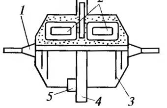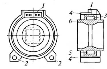 Шинные ТТ класса точности 0,5 изготовляют на напряжение до 20 кВ и номинальный первичный ток до 18 000 А. При таком большом токе целесообразно использовать в качестве первичной обмотки проводник (шину, пакет шин) соответствующей электроустановки. При этом устраняются зажимы первичной обмотки с контактными соединениями. В качестве примера на рис. 3 показан трансформатор тока типа ТШЛ-20 (LL1 — шинный) на напряжение 20 кВ. Магнитопроводы J и 5 с вторичными обмотками залиты эпоксидным компаундом и образуют изоляционный блок 6. Блок соединен с основанием 4 и приливами 2для крепления трансформатора. Проходное отверстие (окно) трансформатора рассчитано на установку шин. Зажимы 7 вторичных обмоток расположены над блоком 6.