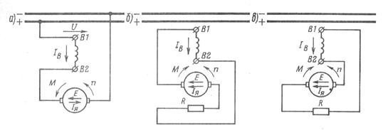 Рис. 5.25. Схемы перехода из двигательного режима (а) в режим реостатного торможения с переключением обмотки возбуждения (б) или обмотки якоря (в)
