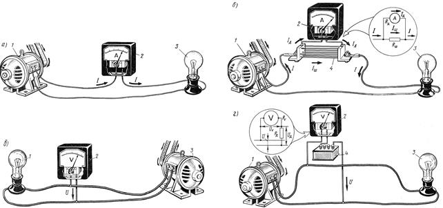 Рисунок 8.13. Схемы для измерения тока (а, б) и напряжения (в, г) Прибор измеряет падение напряжения на шунте, зависящее от проходящего через шунт тока, т.е. используется в качестве милливольтметра. Шунты подбирают к приборам так, чтобы при номинальном напряжении на зажимах шунта стрелка прибора отклонялась на всю шкалу. Для измерения напряжения U, действующего между какими-либо двумя точками электрической цепи, вольтметр 2 (рис.8.13, в) присоединяют к этим точкам, т.е. параллельно источнику 1 электрической энергии или приёмнику 3. Чтобы включение вольтметра не оказывало влияния на работу электрических установок и он не создавал бы больших потерь энергии, вольтметры выполняют с большим сопротивлением. Поэтому можно пренебречь проходящим по вольтметру током. Для расширения пределов измерения вольтметров и уменьшения влияния температуры окружающей среды на показания прибора последовательно с обмоткой прибора включают добавочный резистор 4 (Rа) (рис.8.13, г).