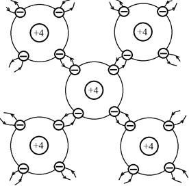 Полупроводники, используемые в технике – кристаллы. Элементы, находящиеся в центре таблицы Менделеева чаще всего являются полупроводниками. Например, германий, кремний, селен, индий, сурьма и др. Могут быть полупроводниками и молекулярные соединения, например, закись мели – Cu O. Рассмотрим полупроводники атомарной структуры. Как правило, они представляют собой кристаллическую решётку, построенную на основе ковалентной (парноэлектронной) связи. На рис. 37 изображена плоская схема кристаллической решётки германия. Германий принадлежит к 4-ой группе таблицы Менделеева, следовательно, у его атома на внешнем электронном уровне расположены 4 слабо связанных с атомами электрона, которые осуществляют связь между данным и соседним атомами, за счёт того, что каждая пара соседних атомов имеет по паре общих электронов. Связи между атомами изображены на рис. пунктирными стрелками.