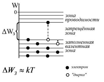 Согласно квантовой зонной теории проводимости, у полупроводников между валентной зоной и зонной проводимости находится запрещённая зона, однако в отличие от диэлектриков энергетическая ширина запрещенной зоны соизмерима со средним значением кинетической энергии электронов, и поэтому наиболее энергичные из них могут оказаться в зоне проводимости. Зонная схема полупроводника с собственной проводимостью изображена на рис. 38