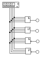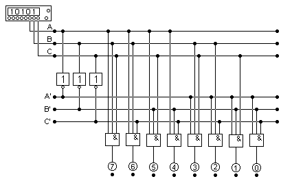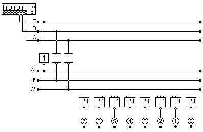 Упражнение № 7 Собрать схему дешифратора из двоичного кода в восьмеричный код, используя логические схемы “ И ” (рис.7), и заполнить таблицу истинности