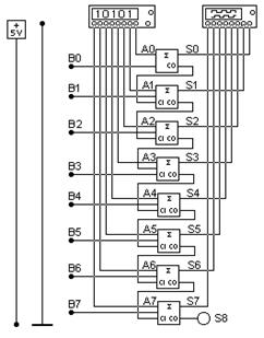 Упражнение № 6 Собрать схему двоичного восьмиразрядного сумматора и выполнить сложение чисел А2 и В2. Варианты чисел приведены в Приложении 1. В качестве источника числа А2 использовать Word Generator, а число В2 задавать с помощью источников напряжения постоянного тока (рис. 6).