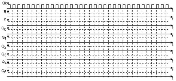 Упражнение № 9 Собрать схему шестиразрядного двоичного счетчика на JK-триггерах (рис.9) и зарисовать временные диаграммы (рис. 10), поясняющие принцип его работы. На первом этапе счет производить с нуля, на втором - со стартового числа D=А, записываемого в нулевом такте.