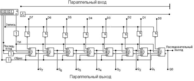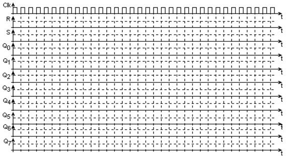 Для ввода данных в параллельном коде использовать источник напряжения постоянного тока и заземление. Примечание: на временных диаграммах R означает сброс, S – запись, Clk – тактовые импульсы, D – входные данные, Q – выходные данные.