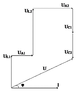 Далее следует строить векторы напряжений на каждом сопротивлении с учетом сдвига фаз относительно вектора тока. При этом целесообразно придерживать схемной (рисунок 14) последовательности расположения сопротивлений и напряжений на них. UL1→ UА1 → UL2→UА2 → UС1 →UС2; б) вектор напряжения на первом индуктивном сопротивлении строим от начало вектора тока под углом 900 в сторону опережения этого вектора (вверх) (рисунок 16) Опережение или отставание вектора определяется характером нагрузки и принятым направлением вращения векторов против часовой стрелки; в) вектор напряжения на первом активном сопротивлении UА1 строим от конца вектора UL1, параллельно вектору тока, т. к. между этими векторами I и UА1 сдвига фаз нет (рисунок 17)