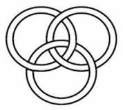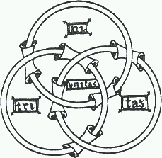 Рис. 4. Кольца Борромео Если подразумевать под кольцами физические подсистемы, то их характерной особенностью является то, что если одно кольцо убрать, то два оставшихся не будут связаны квантовыми корреляциями. Они станут сепарабельными (разделимыми), то есть их запутанность распадается с удалением любого кольца. В этом – их полная аналогия с ГХЦ-состояниями. Эта особенность была замечена практически сразу, как только были проанализированы запутанные состоянийГХЦ-типа, и П. К. Аравинд инициализировал новое направление по изучению топологии запутанности, опубликовав в 1997 году статью «Борромеозапутанность ГХЦ-состояний»*. Данное направление сейчас активно развивается, что подтверждается некоторыми интересными публикациями**. * Aravind P. K., Borromean entanglement of the GHZ state, Quantum Potentiality, Entanglement and Passion-at-a-Distance: Essays for Abner Shimony, eds. R. S. Cohen, M. Horne and J. Stachel,Kluwer, Dordrecht, 1997. Р. 53–59. ** Kauffman L. H. and Lomonaco S. J. Quantum entanglement and topological entanglement, New J. Physics 4. Р. 73.1–73.18 (2002). Кольца Борромео как топологическая структура используются в качестве символа христианской Троицы. Ранее нередко встречались такие символы, как равносторонний треугольник, круг и некоторые другие, но сейчас все чаще Троицу изображают в виде колец Борромео. Одним из самых ранних источников, где было приведено такое символическое изображение Пресвятой Троицы, считается рукопись тринадцатого столетия, которая хранилась в муниципальной библиотеке г. Шартр (Chartres) во Франции. К сожалению, рукопись погибла в огне в 1944 году. Копия рисунка из этой рукописи (рис. 5.) воспроизведена из «Христианской иконографии»* наряду с описанием трех других диаграмм (рис. 6). * Didron M. and Didron A. N., Christian Iconography, or the History of Christian Art in the Middle Ages, George Bell and Sons, London, 1886. Источник:http://www.liv.ac.uk/~spmr02/rings/trinity.html.