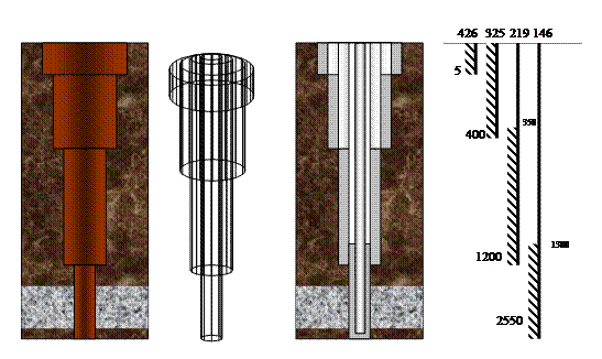 Все эти параметры неразрывно связаны между собой и нарушение одного из них ведет к нарушению другого, что в итоге может привести к осложнениям, авариям или некачественному строительству скважины. Все параметры представлены в основном техническом документе на бурение скважины- геолого-техническом наряде ГТН. Для разобщения пластов, предотвращения обвалов стенок скважины, предотвращения поглощений и проявлений в скважину спускаются обсадные трубы. Пространство между трубами и стенками скважин закачивается цементный раствор. Расположение обсадных колонн с указанием их диаметра, глубины спуска, высоты подъема цементного раствора, диаметра долот, которыми ведется бурение под каждую колонну называется конструкцией скважины. Каждая колонна, входящая в колонну скважины имеет свое назначение: · Направление- самая большая обсадная колонна, предназначена для предохранения устья скважины от размыва, предохранения стенок скважины от осыпания, направления промывочной жидкости в желобную систему. В зависимости от прочности пород глубина спуска составляет от 5м до 40м. · Кондуктор- изолирует водоносные пласты, перекрывает неустойчивые породы, обеспечивает возможность установки противовыбросового оборудования. Глубина спуска от 200 до 800 метров. · Техническая колонна- служит для перекрытия платов при трудных геологических условиях бурения (несовместимые по пластовым давлениям пропластки, зоны высокого поглощения, отложения, склонные к набуханию, осыпанию и т.п.). · Эксплуатационная колонна- необходима для эксплуатации скважины. Она спускается до глубины залегания продуктивного пласта. Ввиду важности ее назначения уделяется большое внимание ее прочности и герметичности.