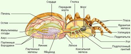 Хелицеровые (Chelicerata) – подтип беспозвоночных животных типа членистоногих (Рис.11.4). Тело состоит из головогруди, от которой отходят шесть пар придатков: хелицеры, предназначенные для фиксации пищи, педипальпы, служащие для осязания, пережёвывания пищи, а также в качестве копулятивного органа) и четыре пары ходильных ног. Представители подтипа известны с кембрия (наземные формы – с девона) и объединяются в четыре класса: мечехвосты, ракоскорпионы, морские пауки и паукообразные.