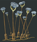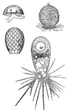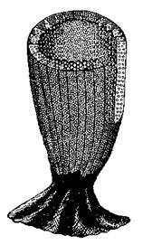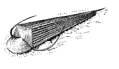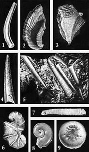 Рис.11.5 Хиолиты Класс вымерших животных, условно относимый к типу моллюсков; некоторые учёные выделяют их в самостоятельный тип. Жили с начала кембрия до перми. Раковина коническая или пирамидальная, от 0,1 до 15 см в длину, замкнутая на узком конце; устье раковины закрывалось крышечкой. У большинства хиолитов спинная и брюшная стороны раковины хорошо различаются по скульптуре. У многих хиолитов полость раковины разделена поперечными перегородками на ряд воздушных камер и одну жилую. Некоторые считают, что раковина была двустворчатая — состояла из конической и плоской створок. Стенка раковины известковая, двухслойная. У некоторых хиолитов имелась пара тонких длинных придатков, отходящих от устья. Обитали в море.