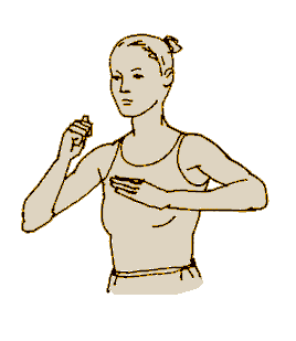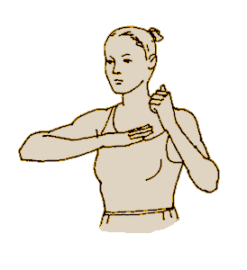 В этом положении несколько раз выполняем форму дыхания 1. Обычный вдох, без усилий - пауза 8 секунд (на вдохе) - обычный выдох, без усилий. Следим за тем, чтобы вдох и выдох не были резкими, принужденными, а спокойными, естественными, с удовольствием. Еще раз. Выпрямляем спину, ноги на ширине плеч. Руки сложены перед собой “в мольбе”. Локти раздвигаем параллельно поверхности пола, соприкоснувшиеся ладони кончиками пальцев вверх. От груди ладони поднимаем вверх, выше, выше, встаем на носочки, тя-а-анемся. Одновременно поворачиваемся сначала в правую сторону, а затем в левую. Считаем вслух. На каждый счет делаем усилия. Помним, что усилия совершаем на вдохе. По 5-10 раз в каждую сторону. Зачем считать вслух? Стеснительный вы наш, когда вы считаете, вы дышите с той интенсивностью, которая нужна. Так что продолжайте считать. Упражнение “Стрела” благоприятно действует на кровеносные сосуды, кожный покров. Это - одно из древнейших упражнений. 8. “Ладонь-кулак”