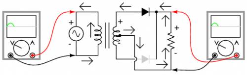 Принцип работы этой схемы нетрудно понять путём анализа по отдельности каждого полупериода. Сначала рассмотрим первый полупериод, когда напряжение источника будет положительным (+) сверху и отрицательным (-) снизу. В этот момент проводит только верхний диод, а нижний блокирует ток, и, следовательно, нагрузка "видит" только первый полупериод синусоиды. В этой части цикла ток протекает только по верхней половине вторичной обмотки трансформатора (см. рисунок ниже).