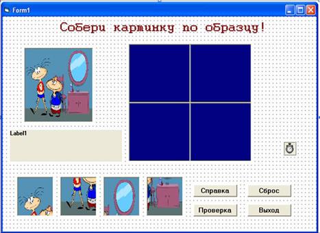 ПРОЕКТ «ПАЗЛЫ» Предварительная подготовка к работе: в любом графическом редакторе разбить произвольный рисунок на 4 части и сохранить в разных файлах (Ris1.bmp, Ris2.bmp, Ris3.bmp, Ris4.bmp). Например, в Paint можно использовать команду ПРАВКА – Копировать в файл. Не изменяйте пропорций рисунков. Создайте ещё один рисунок Ris5.bmp – квадрат с однотонной заливкой (будем использовать его в качестве фона, когда необходимо скрыть предыдущие рисунки). Задание. Разработать проект «Пазлы». Исходный рисунок разбит на 4 части. Необходимо сложить его на пустом поле, разбитом на 4 части. Исходный вид формы показан на рисунке <Рисунок2>. Интерфейс проекта. На форме разместить следующие элементы управления: · метка Label1 (Собери картинку по образцу!); · 4 командные кнопки: Command1 (Выход), Command12 (Проверка), Command3 (Сброс), Command4 (Справка); · поле Image1 – поместить исходный рисунок для образца; · поля Image2 и Image3 - создать как массивы из 4-х элементов каждый (с индексами 0, 1, 2, 3), установить у каждого свойство Strech = True. В поле Image2 необходимо будет собрать рисунок. Первоначально там загружен пустой фон, поэтому в свойстве Picture полей Image2 нужно указать путь к фоновому рисунку Ris5.bmp. В свойстве Picture полей Image3 указать путь к рисункам (Ris1.bmp, Ris2.bmp, Ris3.bmp, Ris4.bmp). Файлы с рисунками скопируйте предварительно в папку с вашим проектом, тогда не нужно будет указывать полный путь к файлам, достаточно указать имя файла; · метка Label2 – для вывода справки (установите свойство Visible= True, чтобы при запуске проекта метка была невидима); · таймер Timer1 – первоначально таймер выключен. Он будет включаться по кнопке «Справка» и через заданный интервал времени скрывать текст, который выведен в метке Label2 (установите свойства таймера Interval = 8000, Enabled = False).