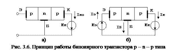 При подаче положительного напряжения на эмиттер возникает определенный эмиттерный ток IЭ (рис.3.6, б). Так как эмиттерный переход находится в прямом включении, дырки проходят в область базы. Там они частично рекомбинируют со свободными электронами базы. Однако база обычно выполняется из полупроводника n-типа с большим удельным сопротивлением (с малым содержанием донорной примеси), поэтому концентрация свободных электронов в базе низкая и лишь немногие дырки, попавшие в базу, рекомбинируют с ее электронами. Вместо исчезнувших при рекомбинации электронов в базу из внешней цепи приходят новые электроны, образующие базовый ток IБ. Большинство дырок, являясь неосновными носителями заряда для базовой области, под действием поля коллектора проходят коллекторный переход, образуя коллекторный ток IК. Связь между приращениями коллекторного и эмиттерного токов характеризуется коэффициентом передачи тока: