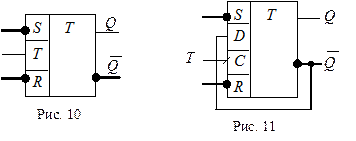 Условное графическое обозначение триггера показано на рис.10. На наборном поле собрать схему согласно рис.11, используя микросхему К155ТМ2. Выходы Таблица 6