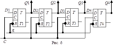 Последовательный регистр (регистр сдвига). Схема 4-х разрядного регистра сдвига на D триггерах показано на рис. 6. В таком регистре используются однофазная передача сигналов. Ввод информации в регистр осуществляется только в прямом коде, подаваемом на информационный вход D, и связь между разрядами регистра производится с прямых выходов предыдущих триггеров на D -входы последующих. Ввод же информации остается парафазным, то есть с прямых выходов триггеров двоичное число снимается в прямом коде, а с инверсных выходов в обратном коде. Установка регистра в исходном нулевом состоянии производится подачи на шину Регистр сдвига широко используется для преобразования последовательного кода в параллельный. Такое преобразование требует подачи последовательного кода на D первого разряда Q 1регистра и подачи сигналов по шине сдвига С.