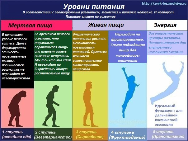 На начальном уровне осознанности человек ест всё. Далее формируются этическо-нравственные основы, повышается осознанность и человек переходит на вегетарианство -молочно-растительную пищу. Затем приходит понимание того, что при термальной обработке, пища теряет самые полезные вещества: ферменты (энзимы), клетчатку. Осознаёт, что является врагом своему телу. Физическое тело человека то, что он ест и перестает употреблять мертвую, термально обработанную пищу. И переходит на сыроедение, на живую растительную пищу. Организм перестаёт тратить колоссальную энергию на пищеварение (вместо 80% тратит примерно 20% жизненной энергии), тело постепенно очищается, закисление организма снижается и энергетический потенциал растет. Осознанность повышается активней. Внутренние ценности о духовном развитии закрепляются всё больше и больше. Организм начинает синтезировать самостоятельно вещества и ферменты (наше Я прошло все царства и способно синтезировать все необходимые элементы). Далее организм трансформируется выше, и он уже способен синтезировать всё из воды – человек переходит на питание водой. Энергетические затраты на пищеварение падают ещё значительнее – примерно до 3%. Следующий уровень – переход на питание праной. Организм питается и синтезирует все необходимые вещества из вездесущей неиссякаемой жизненной энергии. Уровень высокой концентрации становится естественным, человек пребывает в неиссякаемом источнике энергии постоянно. Это идеальная база для дальнейшего духовного развития. На более продвинутом и совершенном уровне человек способен обходится без кислорода. Многие скажут, что лучше пусть все проходит медленно и естественно в физической перестройке. Что на данном низковибрационном уровне физики естественно для тела, то не естественно для тонких высоковибрационных тел и сознания! Сказанное не значит, что физическое тело и вкусовые пристрастия надо резко ломать и переходить на вышестоящий уровень питания. Просто не стоит далеко растягивать и постоянно начинать с понедельника, раз за разом, отодвигая его и оправдываясь очередным понедельником. А кому то и вовсе это не надо. Быть осознанным в своем выборе, а не идти на поводу вкусовых соблазнов. Свои вкусовые рецепторы мы сами перестраиваем и изменяем с самого рождения и имеем сейчас то, что имеем. Застой энергии в эмоциональной сфере проявляется через рецепторы, которые мы взрастили. И от потери целостности сознания и тел- гармонизируем свое состояния извне, через пищу, через вкусовые пристрастия. Совершенствуйтесь, избавьтесь от энергетического застоя на всех уровнях- приобретите целостность и проявляйте желания по собственному намерению, а не по потребности!