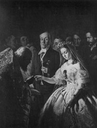 В живописи широкое развитие получили бытовые картины обличительного характера. Показывая острые жизненные сюжеты, художники-шестидесятники стремились прежде всего к наглядности и конкретности живописного повествования, к его ясной во всех деталях разработке, способной донести до зрителя социальный смысл изображенного. Каждый из них находил свои сюжеты, говорящие об окружающем зле (В. И. Якоби - "Привал арестантов", И. М. Прянишников - "Шутники", ил. 135, Н. В. Неврев - "Торг", ил. 136, В. В. Пукирев - "Неравный брак", ил. 137).
