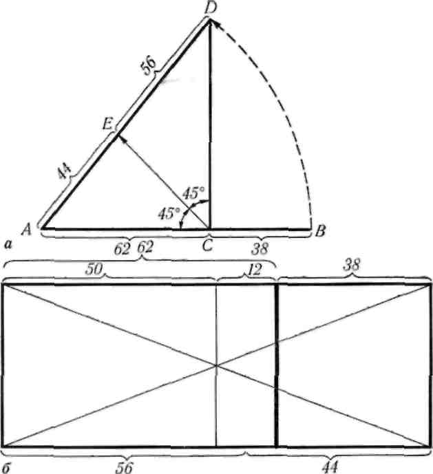 Отрезок АВ делится в пропорции золотого сече- ния (рис. 24, а). Из точки С восставляется перпен- дикуляр СД. Радиусом АВ находится точка D, которая соединяется линией с точкой А. Прямой < АСД делится пополам. Из точки С проводится линия до пересечения с линией AD. Точка Е делит отрезок AD в отношении 56: 44.