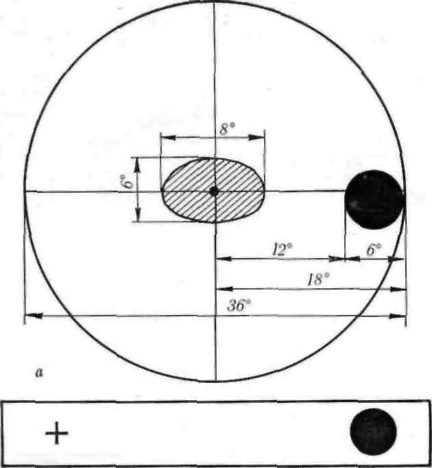 В центре глазного дна есть небольшое углуб- ление—центральная ямка. Это место наилучшего видения. Главный луч зрения всегда направлен по оси: центральная ямка — центр хрусталика — рас- сматриваемый предмет. Вокруг центральной ямки расположилось желтое пятно. Это место дневного зрения и наилучшего цветового восприятия. Чем дальше от желтого пятна, тем меньше колбочек содержит сетчатка и все больше палочек. Палочки приспособлены для сумеречного зрения и для во- сприятия формы. На некотором расстоянии от желтого пятна находится так называемое слепое пятно. Здесь нет ни колбочек, ни палочек, этим местом глаз не видит. Это сосок зрительного нерва.