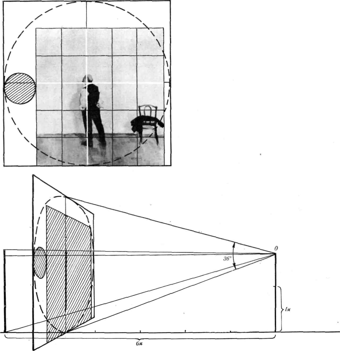 Выше было показано, что для передачи рас- стояния до предмета при работе с натуры необхо- димо изобразить его таким, какой он есть в преде- лах поля ясного зрения (угол зрения 36°). Если же художнику необходимо по эскизу найти расстояние, где поставить натуру для рисунка или этюда, то- гда необходимо эскиз «ввести» в поле ясного зре- ния или, другими словами, в воображаемую кар- тину.