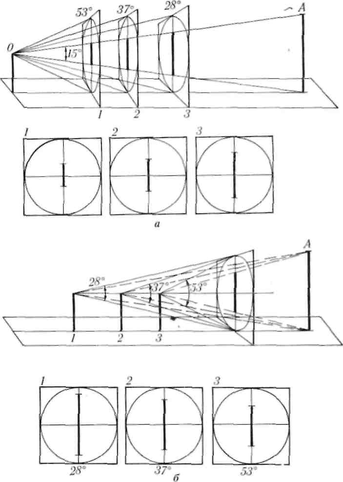 Представим другую ситуацию. Предмет А и кар- тина остаются на своих местах, а художник то приближается к картине, то отходит от нее, т. е. меняется положение точки зрения О и увеличива- ется или уменьшается угол зрения на картину и на предмет (рис. 69, б). При удалении художника от картины и от предмета изображение предмета Л на картине увеличивается (положение 1— 28°),