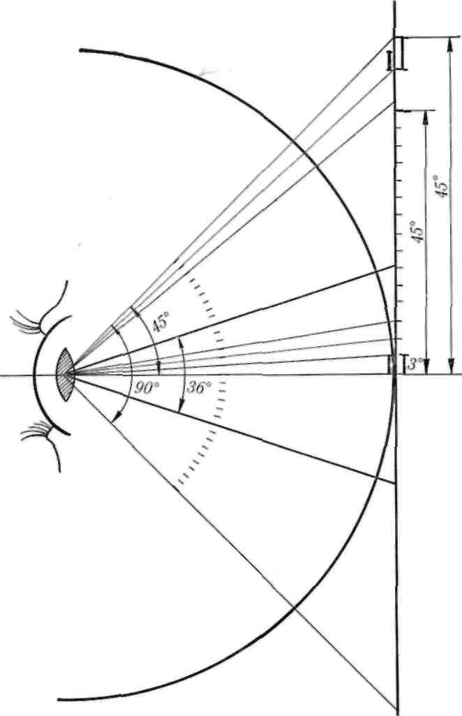 сов от точки зрения, когда угол зрения на картину составляет 36° (рис. 70, а). Бруски на рис. 70, б в пределах поля ясного зрения выглядят одинаковы- ми, а брусок, вышедший за пределы поля ясного зрения, сильно удлинился. То же самое произошло с плитами пола за пределами поля ясного зрения (рис. 70, в). На рис. 70, г табуреты в пределах поля ясного зрения выглядят нормально, а за его пределами искажаются. Причины этого явления становятся понятными, если внимательно рассмот- реть рис. 71: глазное дно сферическое, а карти- на — плоская.
