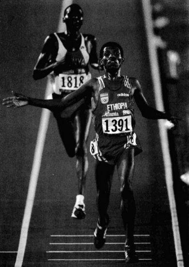 Илл. 31. Восточноафриканский представитель афразийской языковой семьи: эфиопец Хайле Гебреселассие, финиширующий в беге на 10 000 м на олимпийских играх 1996 года впереди кенийца Пола Тергата.