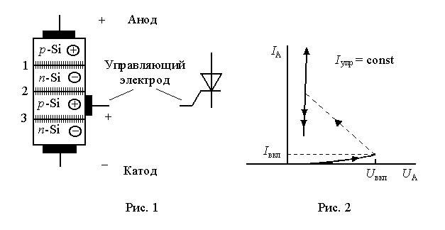 Тиристор – диод (или триод) с тремя электронно-дырочными переходами на основе кремния, в котором явление инжекции используется для переключения тока. Инжекцией называется введение неравновесных (избыточных) носителей заряда под действием ускоряющего электрического поля. Устройство тиристора показано на рис. 1. Крайние переходы 1 и 2 включены в прямом направлении, имеют сравнительно небольшое сопротивление, называются эмиттерными и предназначены для эмиссии (инжекции) дырок из прианодного слоя и электронов из прикатодного слоя в базы – слои между переходами. Средний переход 2 включается в обратном направлении, определяет большое сопротивление тиристора в закрытом состоянии и называется коллекторным. Характеристика тиристора – вольт-амперная (рис. 2), является разрывной. При повышении напряжения на аноде сопротивление коллекторного перехода уменьшается вследствие инжекции. При этом скорость процесса открывания тиристора увеличивается по причине перераспределения напряжения в пользу эмиттерных переходов, что увеличивает ток инжекции. Поэтому открывание имеет скачкообразный характер (на рис. 2 показано пунктиром).