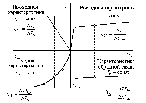На рис. 3 эмиттерный переход включен в прямом, а коллекторный – в обратном направлениях. При этом эмиттер инжектирует дырки в базу, в которой они распространяются вследствие диффузии. Достигая коллекторного перехода, дырки резко уменьшают его сопротивление. Параметры транзистора рассчитываются графическим дифференцированием характеристик в рабочей точке, показанной кружком на рис. 4.