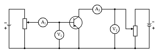 Рис. 4 Установка (рис. 5) состоит из транзистора, двух источников регулируемого напряжения, двух щитовых миллиамперметров постоянного тока А1 (до 1 мА) и А2 (до 15 мА), электронного вольтметра V1 (В7-26) и щитового V2 (до 15 В). Непосредственно к транзистору можно включать только вольтметр В7-26 с большим входным сопротивлением (см. рис. 5).