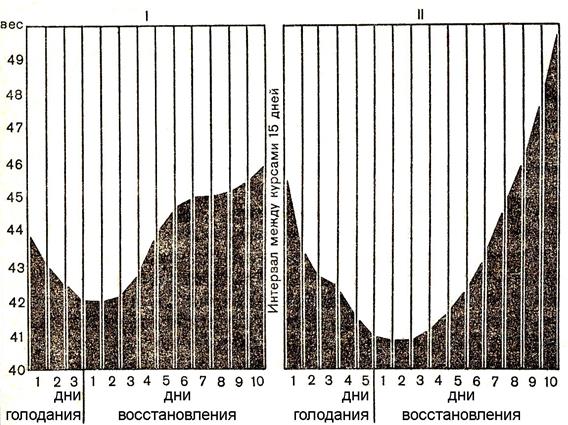 В клинику к нам на лечение методом РДТ постоянно пытаются попасть больные с ожирением, но, как уже говорилось, для излечения их требуется очень длительное пребывание в стационаре (до 80 дней и более). Иногда наше отделение называют в шутку "жиротопкой". Чаще других к нам стремятся молодые девушки, набравшие солидный избыточный вес. Мы им обычно отказываем, так как после прохождения курса лечебного голодания они за короткий срок снова полнеют, не будучи в силах устоять перед гастрономическими соблазнами. А после РДТ продукты усваиваются еще эффективнее, аппетит становится еще сильнее, и необходима большая воля, чтобы ограничивать себя. Для борьбы с ожирением необходим целый комплекс "мер"– волевое ограничение в питании, малокалорийная диета, физические нагрузки, водные процедуры, гимнастика, а самое главное – нужно потратить несколько месяцев постоянных сознательных усилий, чтобы детренировать свой непомерный аппетит. Иногда такие больные действительно едят не так уж много, но они не знают, что им надо есть еще меньше, употребляя даже те же пресловутые каши, от которых якобы "толстеют". Если поглощать их в больших количествах, хорошо сдабривать жиром – да, можно потолстеть, если же потреблять маленькими блюдечками, то можно и похудеть. Только пищу надо длительно жевать, тогда человек, склонный к ожирению, насыщается меньшим количеством еды и не переедает, ибо есть определенная связь между насыщением и количеством жевательных движений. Кроме того, во время длительного жевания перистальтика в кишечнике бывает в 4 раза энергичнее, что способствует лучшей эвакуации и оздоровлению желудочно-кишечного тракта. Наряду с этим к нам обращались за помощью несколько молодых женщин и девушек в состоянии крайнего истощения, вызванного употреблением неподходящей пищи, которая дает "наслаждение", очень вкусна, но не полезна. Эти больные прибегают к так называемому "ресторанному" методу. В ресторанах, в приятной компании, они наслаждаются изысканными блюдами, сопровождая их возлияниями. При насыщении, опасаясь прибавки в весе, идут в туалет, вызывают пальцами у себя рвоту и снова садятся за стол. И так несколько раз за вечер. Довольно скоро – в 2-3 месяца – у больных развивается рвотный рефлекс на каждый прием пищи, даже в домашних условиях. В результате возникает выраженная алиментарная дистрофия со всеми её грозными проявлениями: слабость, головокружения, быстрая утомляемость, худосочие, резкое снижение в организме естественных защитных сил. Лечение этих больных крайне затруднено: рвотный рефлекс не позволяет их кормить, устранить его лекарствами не удается. Приходится вводить им питательные вещества внутривенно или через клизму. Одна девушка, достигшая глубокого истощения, пыталась даже покончить самоубийством. Как правило, нам удается спасти таких больных, хотя это и требует больших усилии со стороны медицинского персонала и длительного пребывания в стационаре. Методом РДТ можно лечить и от худосочия, вызванного различными причинами. Так, в марте 1983 г. к нам поступила больная С., 20 лет. Вес тела 31 кг 200 г при росте 158 см. Состояние тяжелой алиментарной дистрофии. Больная самостоятельно голодала 12 суток, чтобы излечиться от тиреотоксикоза – а он является противопоказанием для длительного лечебного голодания. Восстанавливалась она 14 д
