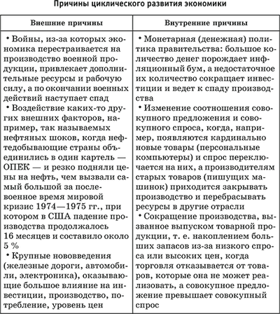 – Экономический подъем (пик) – характеризуется почти полной занятостью активного населения, постоянным расширением производства всех товаров и услуг, ростом доходов, расширением совокупного спроса. – Экономическое сжатие (рецессия) – сокращение производства и потребления, доходов и инвестиций, падение уровня ВВП. – Экономический спад (кризис) – экономика, достигнув дна, топчется на месте. – Оживление – постепенный рост производства, промышленность начинает привлекать дополнительную рабочую силу, растут доходы населения и прибыль предпринимателей. Основными фазами экономического цикла являются подъем и спад, в ходе которых происходит отклонение от средних показателей экономической динамики; реальный ВНП отклоняется от номинального. Некоторые ученые объясняют экономические циклы внешними (экзогенными) причинами, другие – внутренними (эндогенными) факторами.