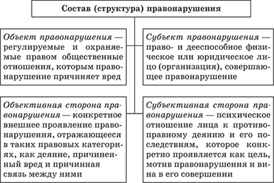 Правонарушение – общественно опасное виновное деяние (действие или бездействие), противоречащее нормам права и наносящее вред обществу, государству или отдельным лицам, влекущее за собой юридическую ответственность. Среди основных признаков правонарушения в юридической науке принято выделять следующие: – Правонарушение – это всегда акт, конкретный вариант поведения человека. Оно характеризуется действием (например, хулиганство) или бездействием (например, умышленное неисполнение должностным лицом приговора, определения или постановления суда). Не могут считаться правонарушением мысли, чувства, политические и религиозные воззрения, не выраженные в действиях. – Правонарушение – это не просто поведение, а волевое поведение человека. Волевой характер поведения означает: действия, зависящие от воли и сознания участников, осуществляемые ими добровольно. Нельзя назвать правонарушением поведение, не контролируемое сознанием, или поведение, совершаемое в ситуации, лишающей человека выбора иного варианта поведения, кроме противоправного. – Правонарушение – это виновное деяние, т. е. деяние, совершая которое индивид сознает, что действует противоправно, виновно (с умыслом или по неосторожности), нанося своим поступком ущерб общественным интересам. – Правонарушение – это действие противоправное, нарушающее требование норм права. Это или нарушение запретов, или невыполнение обязанностей, или использование права вопреки его назначению (злоупотребление правом). Воздержание от активной реализации права правонарушения собой не представляет. Границу противоправности устанавливает государство. Любое правонарушение противоправно, однако не всякое противоправное поведение – правонарушение. – Правонарушение – это общественно опасное деяние, так как ставит под угрозу нормальное развитие и функционирование происходящих в рамках конкретного общества отношений. Общественная опасность – основной объективный признак, отграничивающий правомерное поведение от противоправного. – Правонарушение всегда порождает вредоносные последствия. Всякое правонарушение наносит вред интересам (имущественным, социальным, моральным, политическим и т. п.) личности, общества, государства. Все перечисленные признаки должны действовать в системе. Отсутствие хотя бы одного из них не позволяет рассматривать деяние как правонарушение. Соответственно, не является правонарушением вариант поведения, хотя и нарушающий правовые предписания, но не наносящий ущерб. Действие, хотя и социально опасное, но осуществляемое в рамках правовых предписаний, также не считается правонарушением, как и не относится к таковым и противоправное деяние недееспособного лица. Юридическая наука выделяет объективные и субъективные признаки правонарушения, которые в своей совокупности образуют его состав. Юридический состав правонарушения – это система необходимых и вместе с тем достаточных с точки зрения действующего законодательства для возложения юридической ответственности признаков правонарушения. Без наличия хотя бы одного из них лицо не может быть привлечено к ответственности, поскольку данное деяние не будет считаться правонарушением.