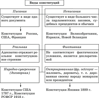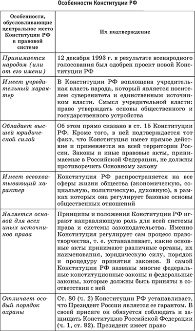 Конституция [12] – (от лат. constitutio – установление, устройство) – это единый, обладающий особыми юридическими свойствами нормативный правовой акт, посредством которого народ учреждает основные принципы устройства общества и государства, закрепляет правовой статус человека и гражданина. Конституция как Основной закон государства и общества имеет ряд отличий от других правовых актов: – Имеет учредительный, основополагающий характер. Регулирует широкую сферу общественных отношений, наиболее важные из которых затрагивают коренные интересы всех членов общества, всех граждан. Закрепляет основы общественно‑экономического строя государства, его государственно‑территориальное устройство, основные права, свободы и обязанности человека и гражданина, организацию и систему государственной власти и управления, устанавливает правопорядок и законность. Поэтому конституционные нормы – основополагающие для деятельности государственных органов, политических партий, общественных организаций, должностных лиц и граждан. Нормы конституции первичны по отношению ко всем другим правовым нормам. – Обладает высшей юридической силой. Действие конституции распространяется на всю территорию государства. Все законы и иные акты государственных органов издаются на основе и в соответствии с конституцией. Строгое и точное ее соблюдение – это наивысшая норма поведения для всех граждан, всех общественных объединений. – Характеризуется стабильностью. Это определяется тем, что конституция закрепляет устои общественного и государственного строя и рассчитана на длительный срок действия, а также особым порядком ее принятия и изменения. – Содержит нормы, имеющие прямое действие. Конституционные нормы действуют без утверждения какими‑либо органами государственной власти или должностными лицами.