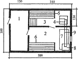 Рис. 7. Семейная баня на 6–8 человек: 1 – предбанник; 2 – моечная; 3 – парная; 4 – П‑образная печь; 5 – полок; 6 – скамейка; 7 – ванна с холодной водой; 8 – бак с водой; 9 – дымоход.
